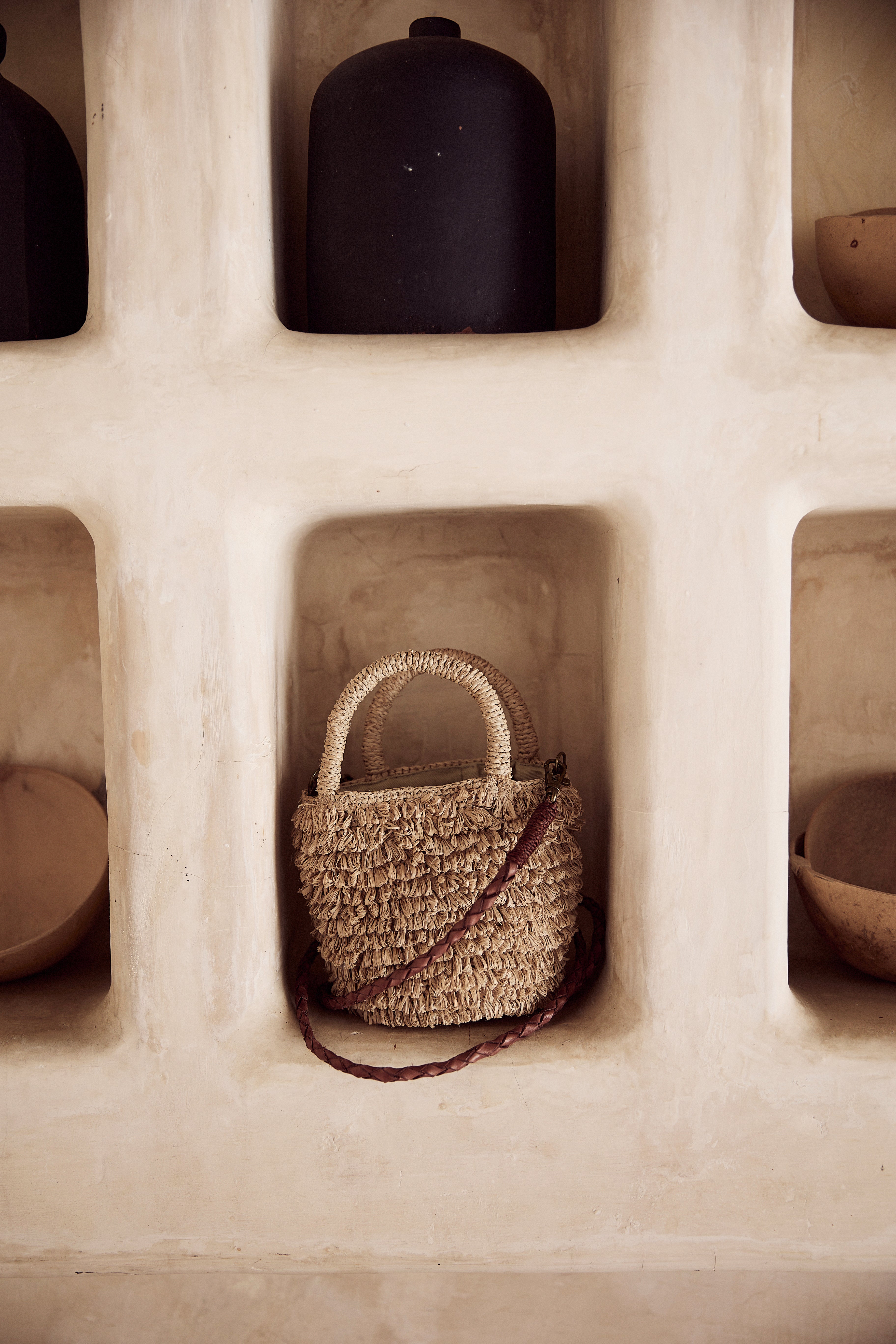 - Transform a vintage piece of furniture with shelves into a storage space for your handbags: your favorite RAFFIA bags will proudly take pride of place there, adding an authentic touch to your bedroom decor.
