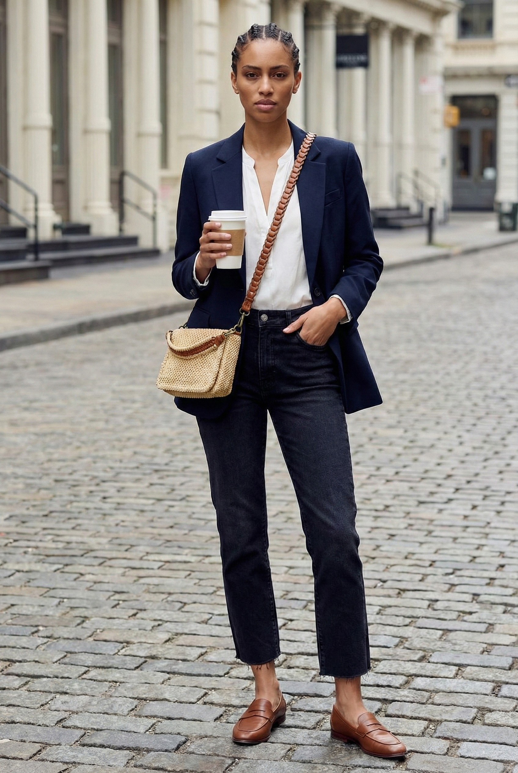 It is entirely possible to combine casual pieces with sophisticated items in the same outfit. This is the smart casual trend! Those who juggle meetings and business trips will appreciate adding a trendy and functional accessory such as the RAFFIA bag to their outfit RAFFIA pairing it with raw denim jeans, a blazer, and leather loafers. The perfect combination for creating a trendy look that is both practical and elegant...